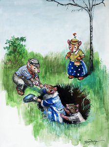 After the war he worked mainly on comics and adventures like "The Three Musketeers" or "Ali Baba and the 40 Robbers". He also gained great fame in Germany with his drawings for fables and fairy tales. For example, the stories of the city mouse and the country mouse or "The Wind in the Willows" from his pen are unforgotten. He also skilfully stages the experiences of "Alice in Wonderland" and "Gulliver's Travels". Generations of children have loved his drawings. The pictures of the "Borgers", a family of tiny creatures that live under the floorboards of a house, have decorated many a child's dream.