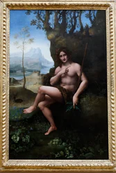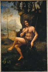(Louvre museum, Paris, France. Leonardo da Vinci's workshop, credited to Francesco Melzi, Saint John the Baptist, oil on panel transferred to canvas, c. 1510-1520.)