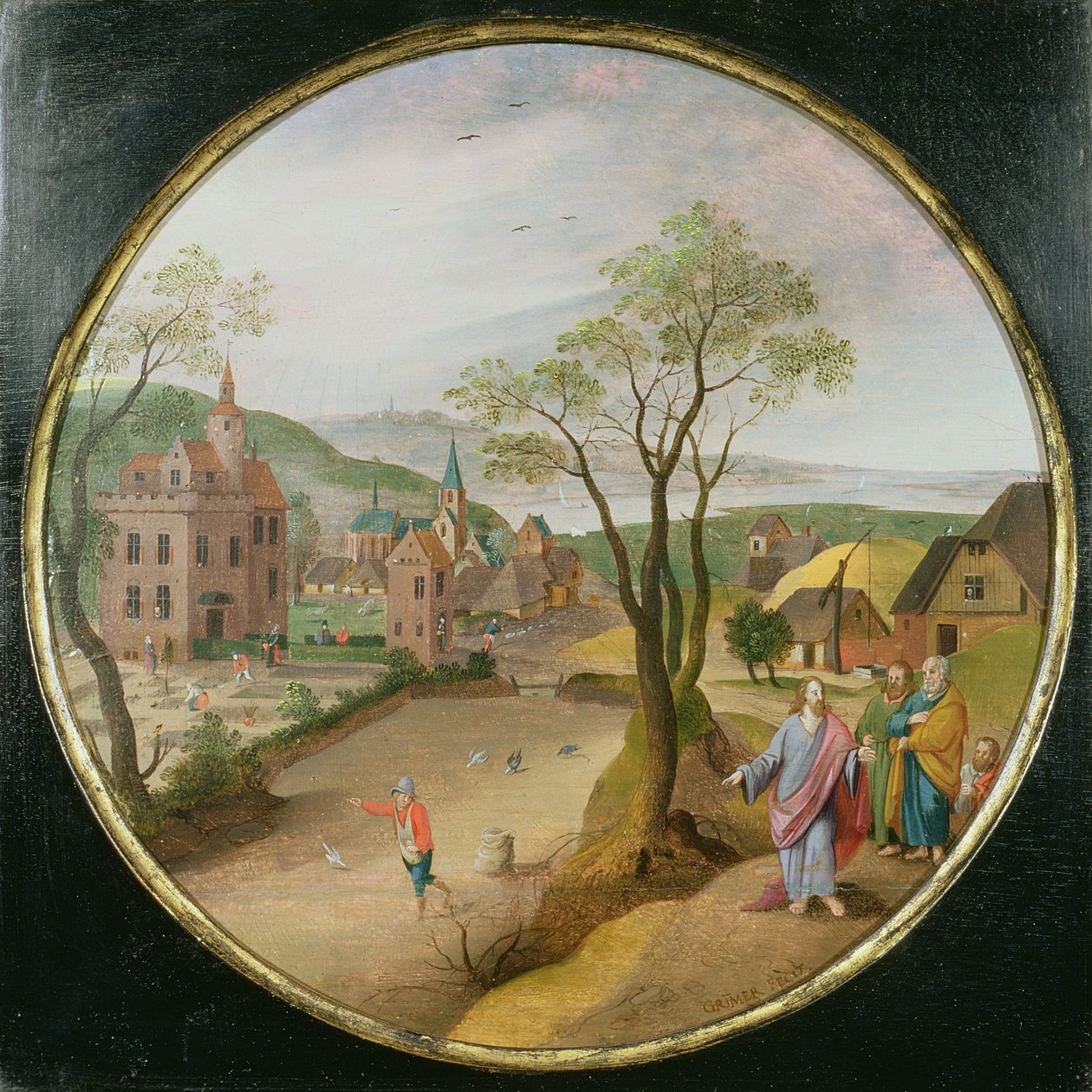 season · seasonal · roundel · sowing · farming · seed · spreading · word · good news · view · christ · disciples · disciple · The Bowes Museum, Barnard Castle, County Durham, UK / Bridgeman Images |
