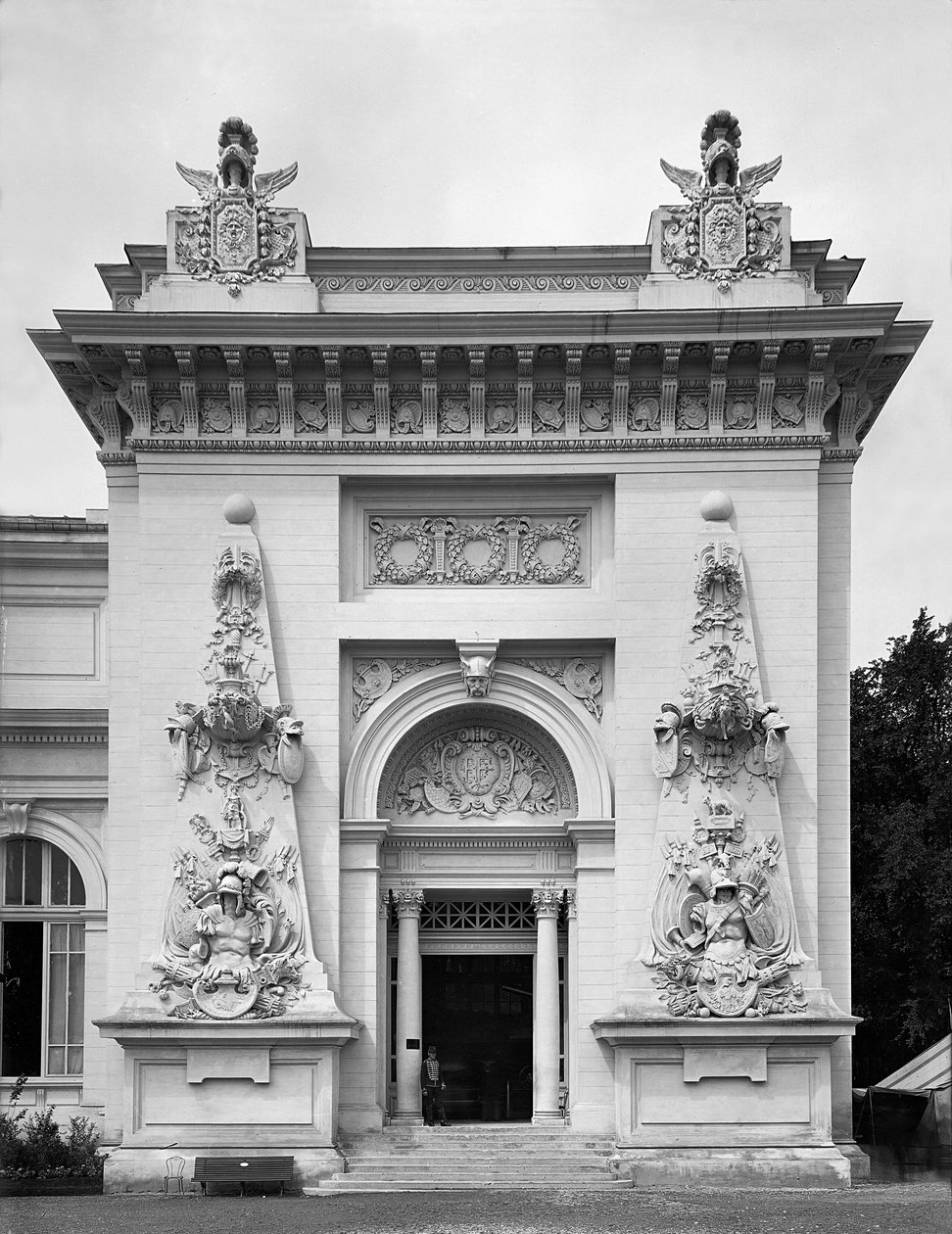 exterior · architecture · sculpture · army · trophy · trophies of war · winged helmet · armour · glass plate negative 30x40 · french third republic · shield · arch · column · Paris, France / Bridgeman Images |