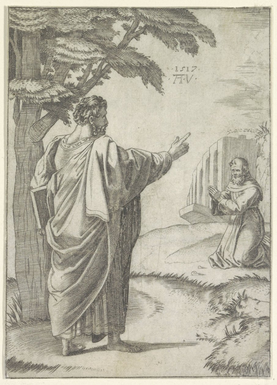 Saint Paul and a Franciscan monk(Heilige Paulus en een Franciscaner monnik)Agostino Veneziano(print maker) |