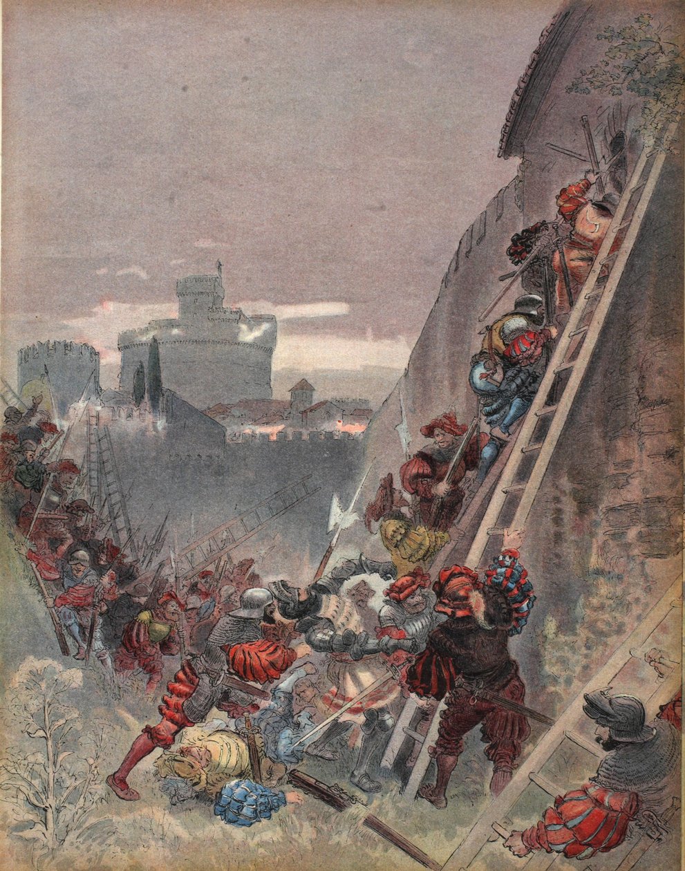 renaissance · c16th · mutiny · rome · papal states · sack of rome · battle · combat · walls · wall · ladder · climbing · ascending · siege · attack · imperial army · castel santangelo · vatican city · Private Collection / Bridgeman Images