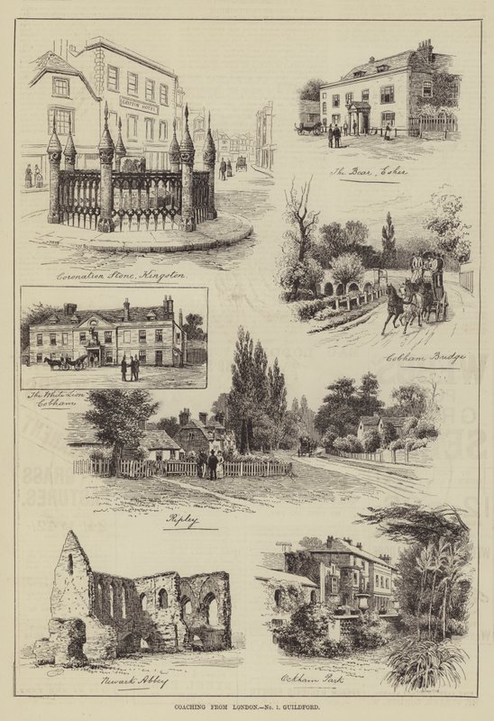 coaching · london · guildford · coronation stone · kingston · bear · esher · white lion · cobham · cobham bridge · ripley · newark abbey · ockham park · travel · coach · coaches · Private Collection / Bridgeman Images · / Look and Learn |