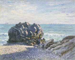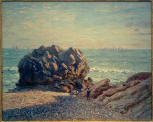 outdoors · people · male · erosion · beach · arts · painting · coastal · wales · rocks · rock · sunlight · science · geology · solar system · astronomy · geography · color · colour · horizon · cove · century · impressionist · swansea · 19th century · background people · impressionism · nineteenth century · geographical feature · oil on canvas · alfred sisley · arthur sisley · sisley · alfred · sisley · arthur · national museum cardiff · kay kays · ladys cove · langland bay · rotherslade bay · storr's rock · National Museum of Wales/Heritage-Images