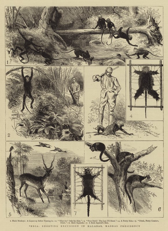 india · shooting excursion · malabar · madras presidency · black monkeys · liquor · turning · skin · poor devil · shoot · pretty skin · drink · pretty creature · rock squirrels · rock squirrels skin · hunting · chennai · wildlife · monkeys · primates · antelopes · Private Collection / Bridgeman Images · / Look and Learn |