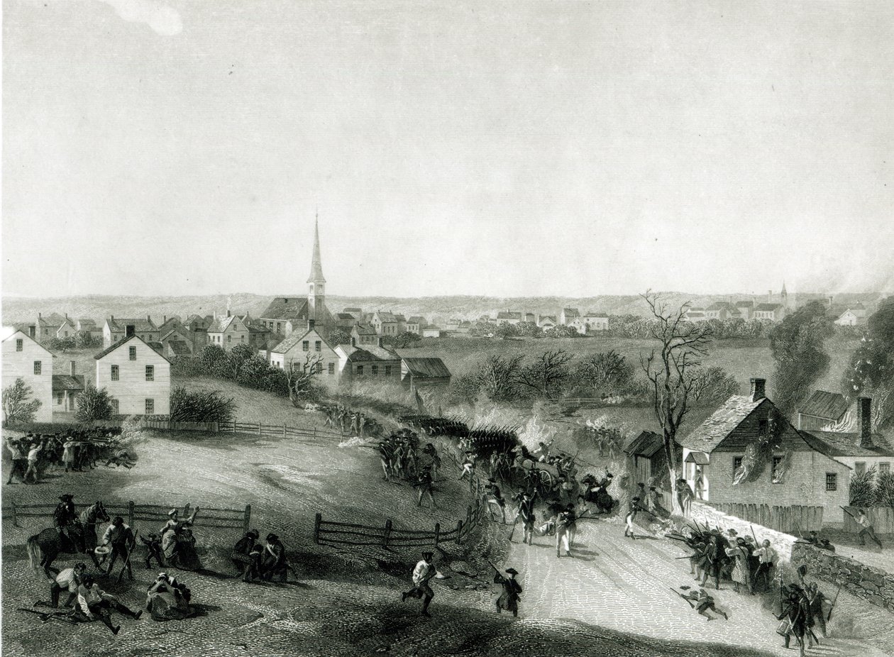 revolutionary war · american war of independence · massachusetts · soldiers · fighting · battle · town · american revolutionary war · burning · houses · Private Collection / Bridgeman Images |