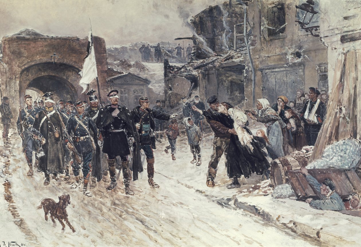 white flag · fury · anger · blind-fold · ruin · siege · franco-prussian war · france · prussian · prussia · entry of german parliamentarians · november 4 · Musee de l'Armee, Paris, France / Bridgeman Images