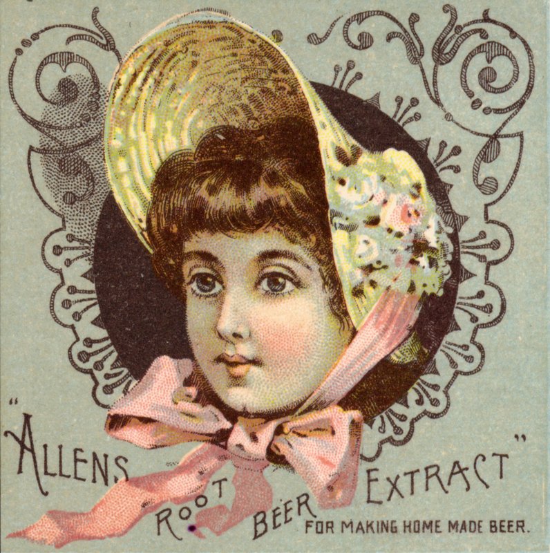 advertising · card · ephemera · girl · bonnet · allens root beer extract · home · brewing · pink · ribbon · Private Collection / Bridgeman Images · / Look and Learn |
