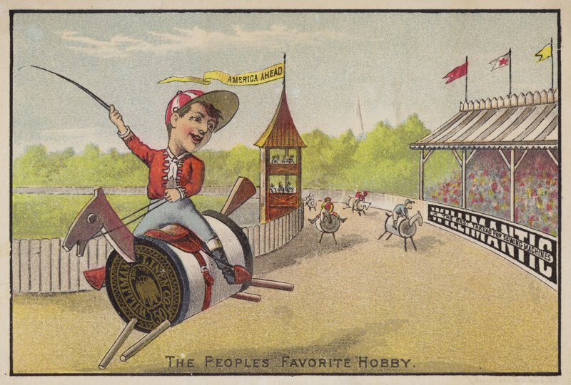 advertising · ephemera · horse · horses · wooden horses · running · racing · galloping · trotting · cotton reels · cotton · thread · jockey · jockeys · whip · colours · smiling · fence · fencing · track · race track · tower · flags · stand · stands · audience · crowd · race goers · america ahead · the peoples favorite hobby · willimantic · the best thread for sewing machines · sewing machine · sewing · Private Collection / Bridgeman Images · / Look and Learn |