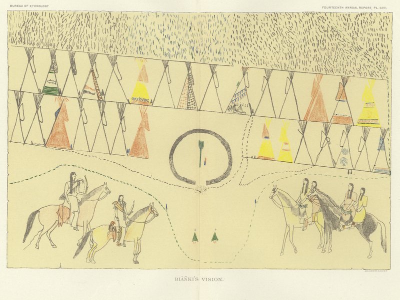 19th century · america · american · american indian · american indians · american native indians · anthropology · arrow · arrows · bianki · vision · engraving · engravings · ethnographic · ethnology · figure · figures · ghost dance · ghost-dance · horse · horses · ideogram · ideograph · illustration · illustrations · indian · indians · indigenous · male · native · peoples · north america · north american · pictogram · pictograph · pictographs · religion · religious · social · history · spiritual · teepee · tepee · tipi · tribal · tribe · tribes · Private Collection / Bridgeman Images · / Look and Learn |