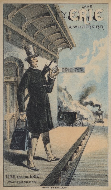 train · advertising · card · railways · steam · trade · advert · railway · running · historical · timing · western railroad · prompt · engine · watch · the lake erie · case · business · briefcase · time · carriage · american · america · on time · track · pollution · history · usa · Private Collection / Bridgeman Images · / Look and Learn |