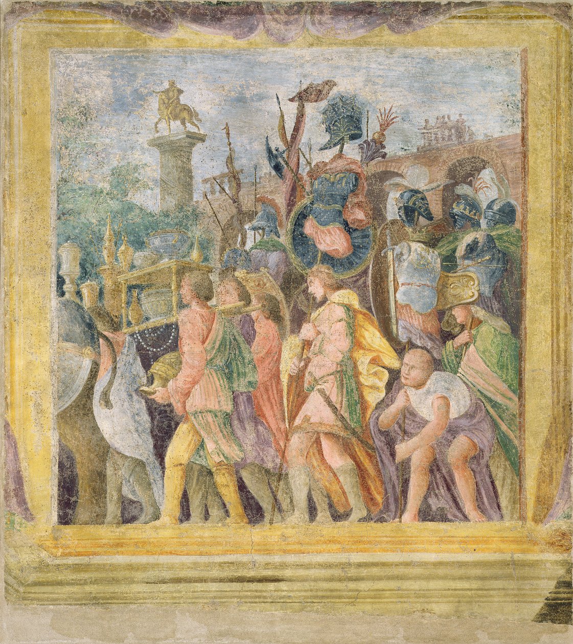 triomphe de cesar · procession · parade · march · treasure · helmet · riches · booty · armour · banner · flag · aqueduct · viaduct · victory · finery · celebration · shield · triumphant · julius caesar · Palazzo Ducale, Mantua, Italy / Bridgeman Images |