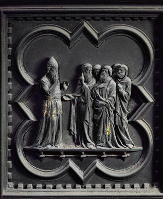 The Disciples Visit Jesus, fourteenth panel of the South Doors of the Baptistery of San Giovanni(The Disciples Visit Jesus, fourteenth panel of the South Doors of the Baptistery of San Giovanni, 1336 (bronze))Andrea Pisano |