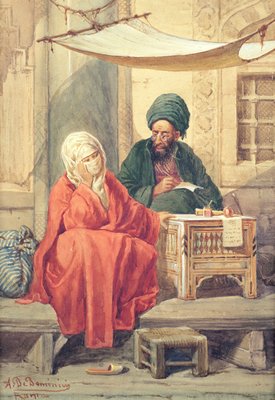 female · slipper · veiled · academic · writing table · desk · quill · illiterate · orientalist · Private Collection / Bridgeman Images