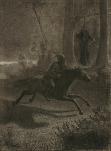 darkness · fear · shadow · horse · hanging · tree · grass · path · rider · gallows |