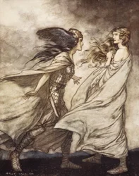 Fasolt Suddenly Seizes Freia and Drags Her to One Side with Fafner, 1910('Fasolt suddenly seizes Freia and drags her to one side with Fafner', 1910. )Arthur Rackham |