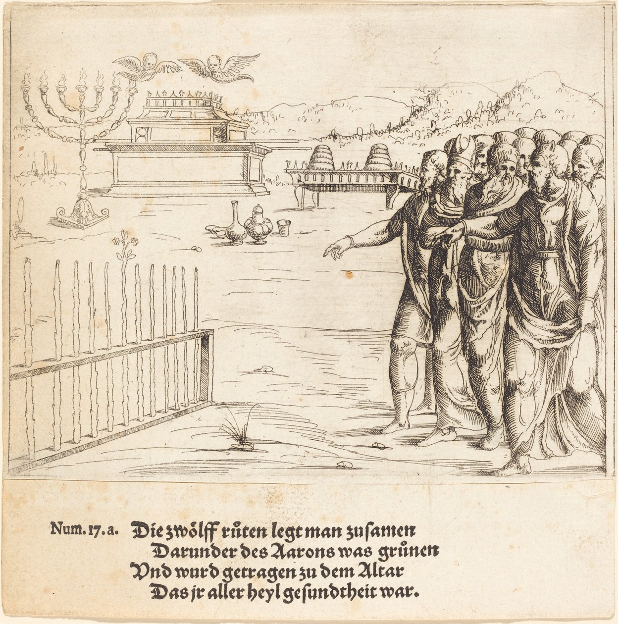 germany · people · male · religious · german · arts · country · religion · washington · christianity · judaism · jewish · location · century · drawing · gallery · biblical · walking stick · torah · art gallery · menorah · old testament · black white · black and white · national gallery of art · 16th century · sixteenth century · aaron · bible scene · etching · etching · augustin hirschvogel · biblical character · hirschvogel · augustin · hirsvogel · augustin · art centre · heritage art · print · aaron's rod · Heritage Art/Heritage Images
