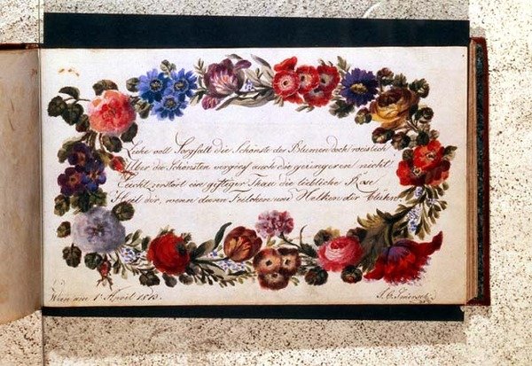 Frontispiece of a visitors book decorated with an epigram in German surrounded by a garland of flowers, dated 1st April, 1813(Frontispiece of a visitors book decorated with an epigram in German surrounded by a garland of flowers, dated 1st April, 1813 (wc))Austrian School |