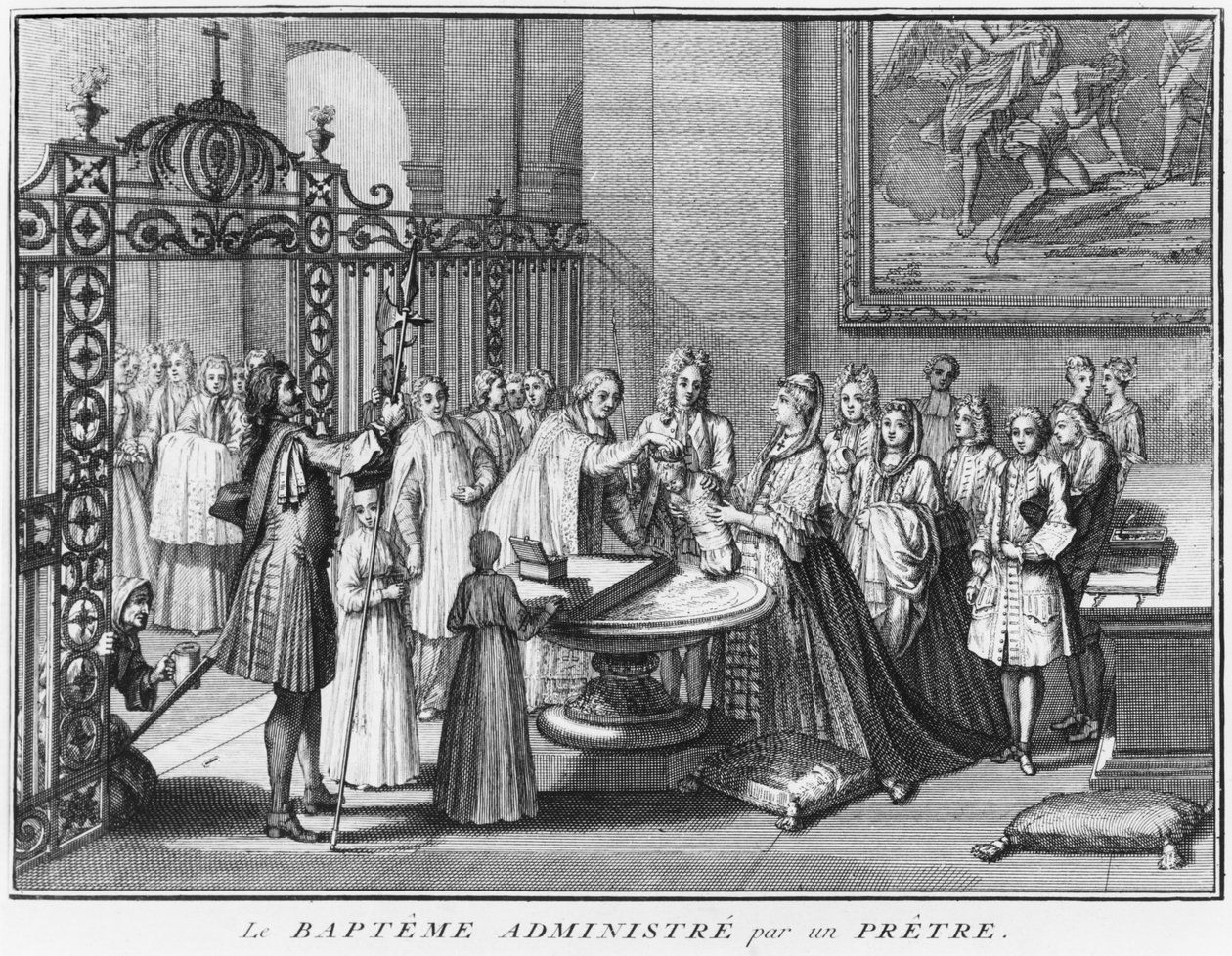 Priest baptising, illustration from 'Religious Ceremonies and Customs of all the nations of the world', published Amsterdam, 1723(Priest baptising, illustration from 'Religious Ceremonies and Customs of all the nations of the world', published Amsterdam, 1723 )Bernard Picart |