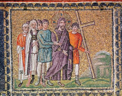 la montee au calvaire · passion scene · jesus · cross · cross-bearer · guard · jewish · procession · crowd · bearing · Early Christian · Sant'Apollinare Nuovo, Ravenna, Italy / Bridgeman Images