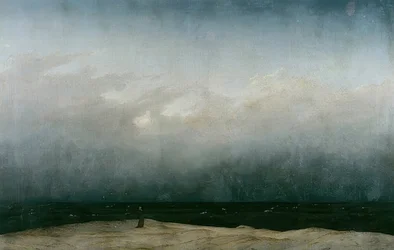 If we only consider the choice of motif, Frederick's recurring patterns emerge. The painting shows a dune, very bare and in the color beige to whitish, which seems in the left half of the picture into the lake or the sea seems. The surface of the water is almost black in color and above the horizon, it fumes like clouds of fog into the cloud layer, so that a transition from water to clouds is barely visible. Towards the sky, the gradient changes smoothly into a dark blue. Although we can imagine the sunlight behind the dense clouds, the time of day remains hidden from us. The painting is dominated horizontally, only the monk standing on the small hill on the left forms a vertical line. As in Frederick's most famous painting "The Wanderer above the Sea of Fog", this is a back figure that expresses the hopeless quality of space in the transcendental hopelessness in the encounter of man and nature. The enigmatic and for his time so radical appearance receives the painting through the lack of spatial depth. Shore, water and sky are layered without any spatial transition, creating the impression of a surface and it lacks the time-classic frame show, which gave the images of the time depth and accessibility. The interpretations of images have meanwhile assumed an unmanageable number in the history of art. Whether the image speaks of the consciousness of being at the mercy of the dark, unquestionable forces of nature and history, or whether it is only about a monk left by God, ultimately remains in the balance. lonesome figure · solitary · exile · hermit · snow · bleak · coast · shoreline · white horses · habit · prayer · praying · romantic · solitude · ocean · beach · stormy · strom · tempest · romanticist · romanticism · cloud · sublime · Alte Nationalgalerie, Berlin, Germany / Bridgeman Images
