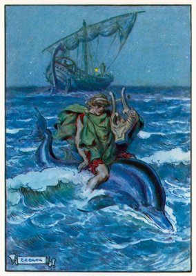 20th century · colour · dolphin · animal · star · greece · europe · legend · lyre · music instrument · music · mythology · seated · lithograph · print · mzprint · / Bridgeman Images