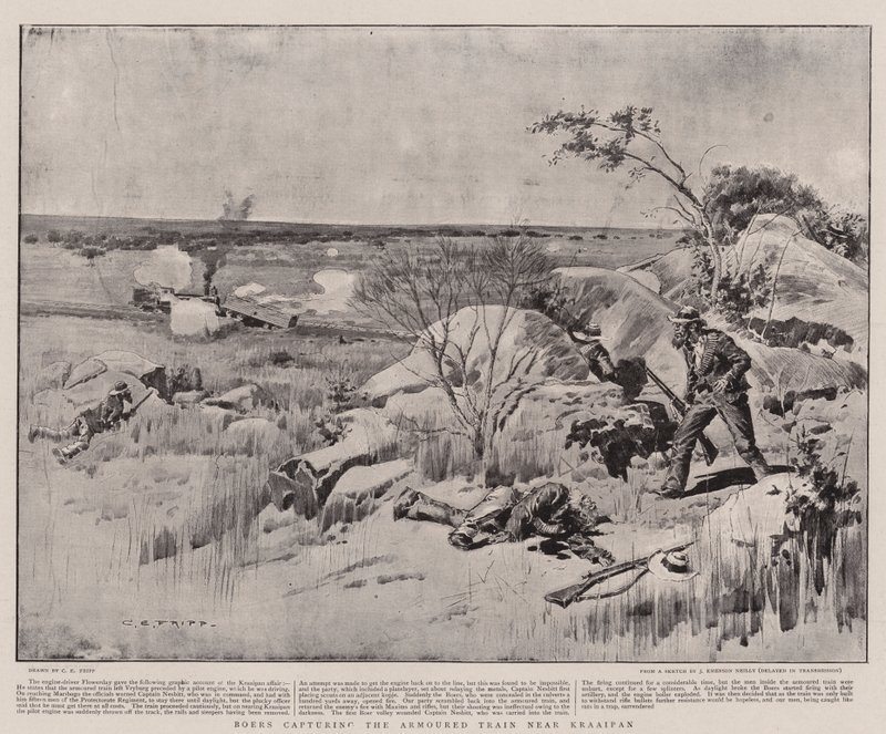 Boers capturing the Armoured Train near Kraaipan(Boers capturing the Armoured Train near Kraaipan )Charles Edwin Fripp |