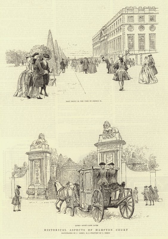 historical aspects · hampton court · east front · time of george ii · queen annes lion gates · Private Collection / Bridgeman Images · / Look and Learn |
