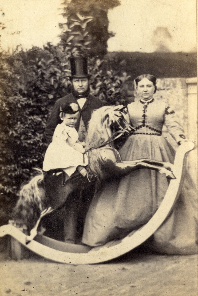 family · portrait · group · rocking horse · garden · outdoors · male · female · mother · father · top hat · victorian · child · daughter · girl · young · formal · black and white photograph · b/w photo · children · full length · aristocratic · aristocracy · toys · solemn · parents · stovepipe hat · Private Collection / Bridgeman Images |
