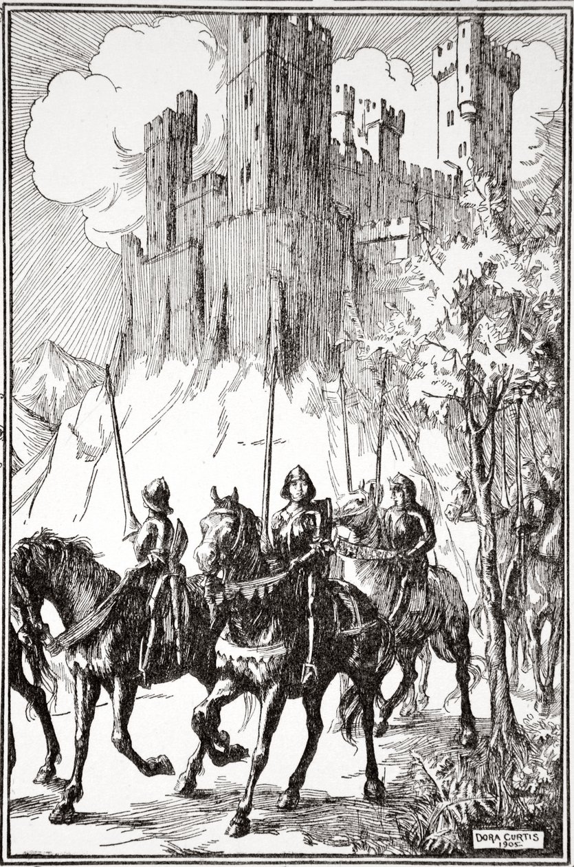 animal · building · buildings · england · people · male · animals · horses · horse · riding · rider · country · tower · monarch · british · weapon · weapons · english · castle · king · royal · medieval · fortification · location · century · britain · knight · royalty · horseback · concept · legend · myth · mythology · monochrome · warfare · king arthur · black white · black and white · weaponry · legendary · mediaeval · middle ages · lance · 1900s · 20th century · galahad · arthurian · gawain · mythical figure · sovereign · sir galahad · beatrice · historica graphica collection · dora curtis · beatrice clay · clay · knight of the round table · curtis · dora · Historica Graphica Collection/Heritage Images