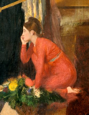 vertical · nature · side view · female · caucasian · women · woman · people · bending · girl · girls · interior · indoors · flower · flowers · plant · arts · painting · country · french · france · window · watching · color · colour · profile · viewing · dress · location · century · thinking · inside · bouquet · daydreaming · barefoot · lady · concept · searching · worrying · full body · impressionist · preoccupied · dreamy · domestic life · wistful · 19th century · impressionism · nineteenth century · art media · young adult · illustration and painting · edgar degas · edgar germain hilaire degas · hilaire-germain-edgar de gas · degas · edgar · Art Media/Heritage Images