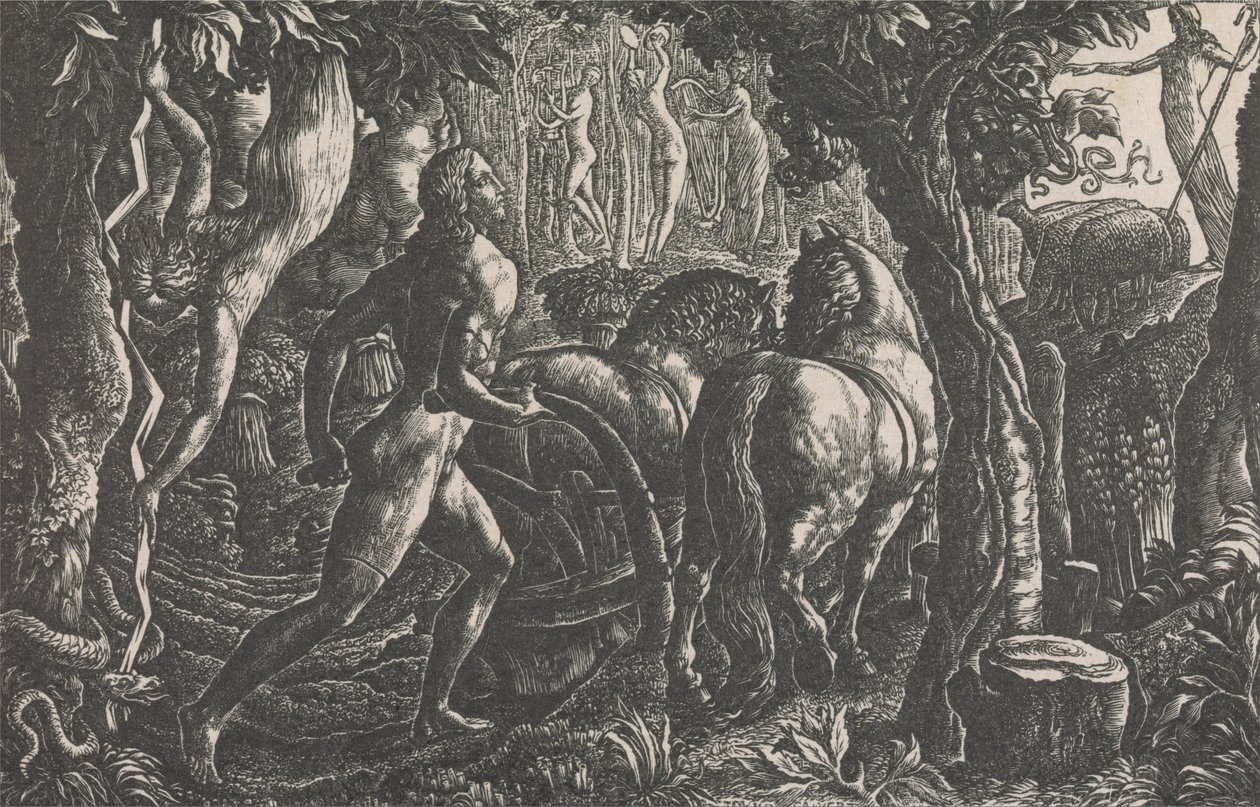 monochrome · ground · horses · plow · trees · women · naked · muscles · branches · Plowman