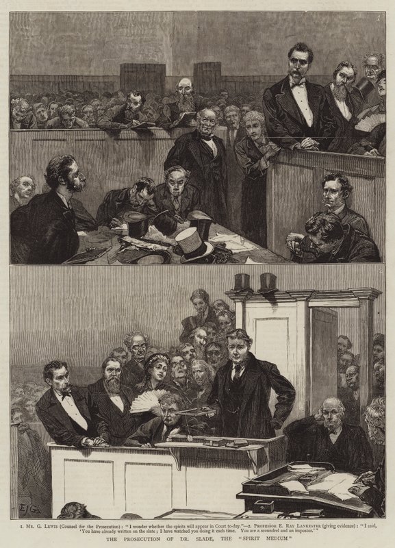 prosecution · dr slade · spirit medium · mr g lewis · counsel · professor e ray lankester · courts · trials · henry slade · psychics · fraud · Private Collection / Bridgeman Images · / Look and Learn |