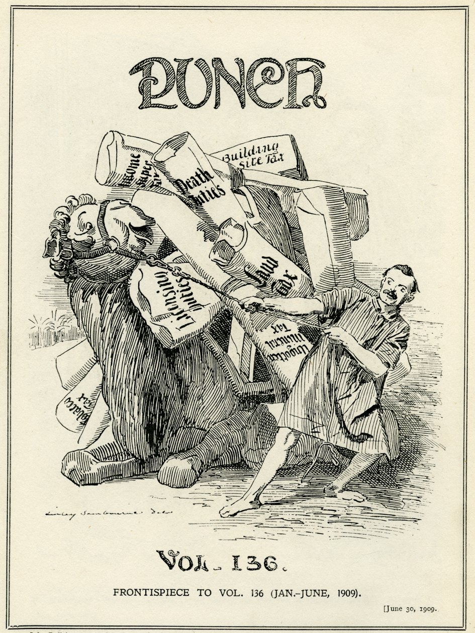 John Bull, depicted as a camel, is reluctant to carry the new tax burdens imposed by Lloyd George in 'The People's Budget', frontispiece for Punch Magazine(John Bull, depicted as a camel, is reluctant to carry the new tax burdens imposed by Lloyd George in 'The People's Budget', frontispiece for Punch Magazine, June 30, 1909 )Edward Linley Sambourne |