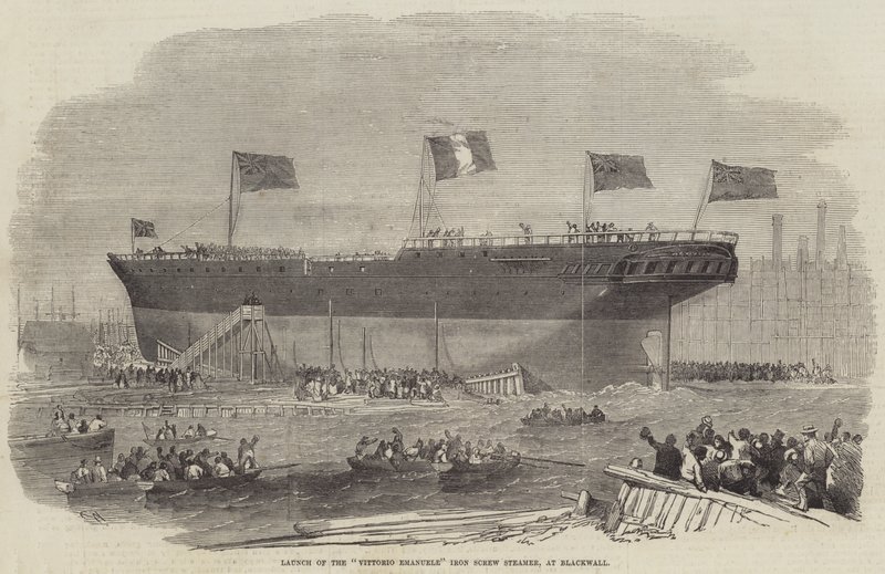 launch · vittorio emanuele iron screw steamer · blackwall · ship launches · ships · maritime · london · Private Collection / Bridgeman Images · / Look and Learn