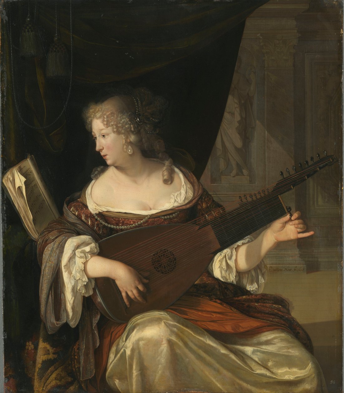 sheet music · classical · instrument · bosom · lady · musician · music · practicing · dull colors · curly hair · woman giving · theorbo