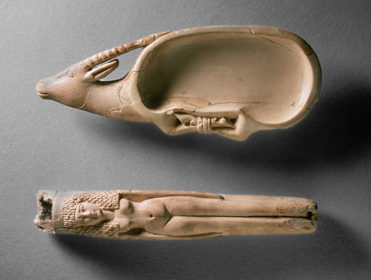 Kohl tube in the form of a nude female and cosmetic dish in the form of an ibex with bound legs, from Tomb 562, Qau(Kohl tube in the form of a nude female and cosmetic dish in the form of an ibex with bound legs, from Tomb 562, Qau )Egyptian 19th Dynasty |