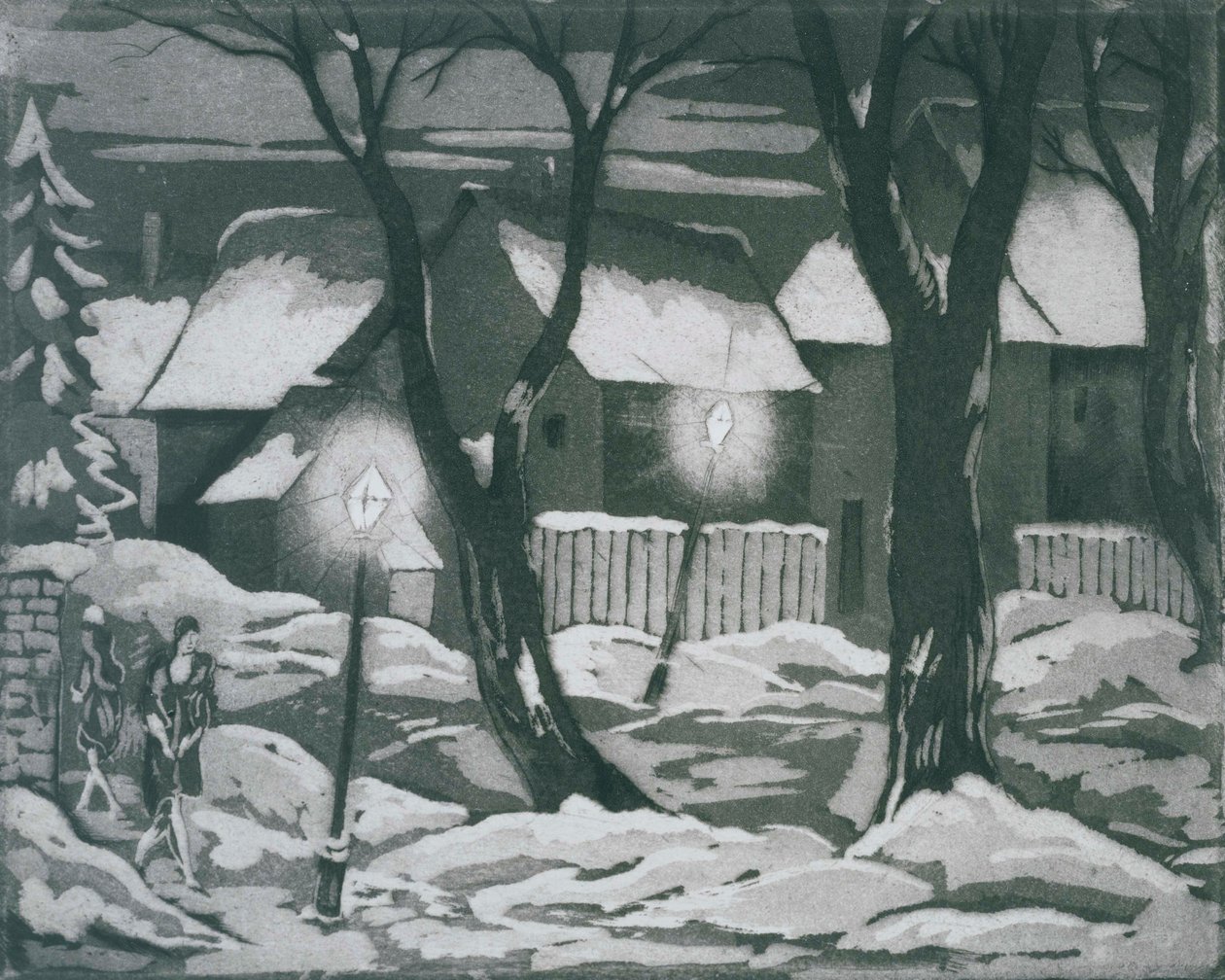 snow · walking · streetlights · woman · houses · fences · trees · clouds · night · serene |