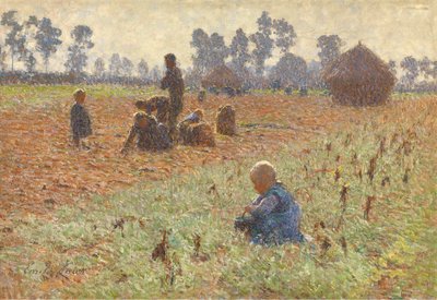 people · harvest · children · field · trees · crops · green · yellow · blue · brown · gathering · corn