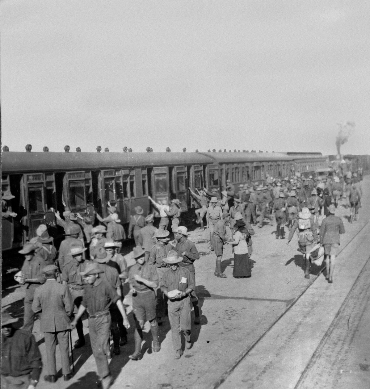world war one · first world war · soldier · soldiers · troops · train station · platform · return · returning · transportation · arrival · departure · National Army Museum, London / Bridgeman Images
