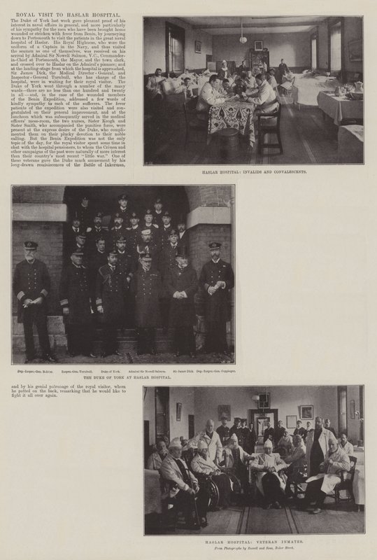 royal visit · haslar hospital · invalids · convalescents · duke of york · deputy inspector general bolster · inspector general turnbull · admiral sir nowell salmon · sir james dick · deputy inspector general coppinger · veteran inmates · hospitals · hospital patients · hampshire · royalty · Private Collection / Bridgeman Images · / Look and Learn |
