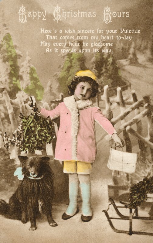 edwardian postcard · child · children · happy christmas · mistletoe · Private Collection / Bridgeman Images · / Look and Learn |