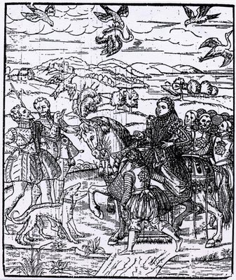 16th century · england · united kingdom · europe · hunt · court (royal) · elizabeth i queen of england (1533-1603) · house of tudor · horse riding · engraving · bird · queen · royalty · black and white · outside · hound · animal · mzengraving · elizabethan era (1558–1603) · tudor period (1485-1603) · · / Bridgeman Images