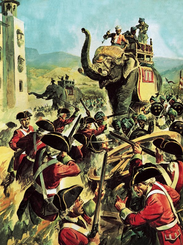robert clive · india · fort · siege · elephants · arcot · rifles · uniform · Private Collection / Bridgeman Images · / Look and Learn |