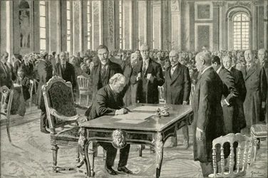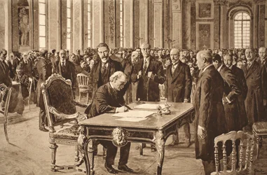 Britain's Prime Minister Signing the Treaty of Peace with Germany in the Hall of Mirrors at Versailles, June 28th, 1919(Britains Prime Minister signing the Treaty of Peace with Germany in the Hall of Mirrors at Versailles, June 28th, 1919 )English School |