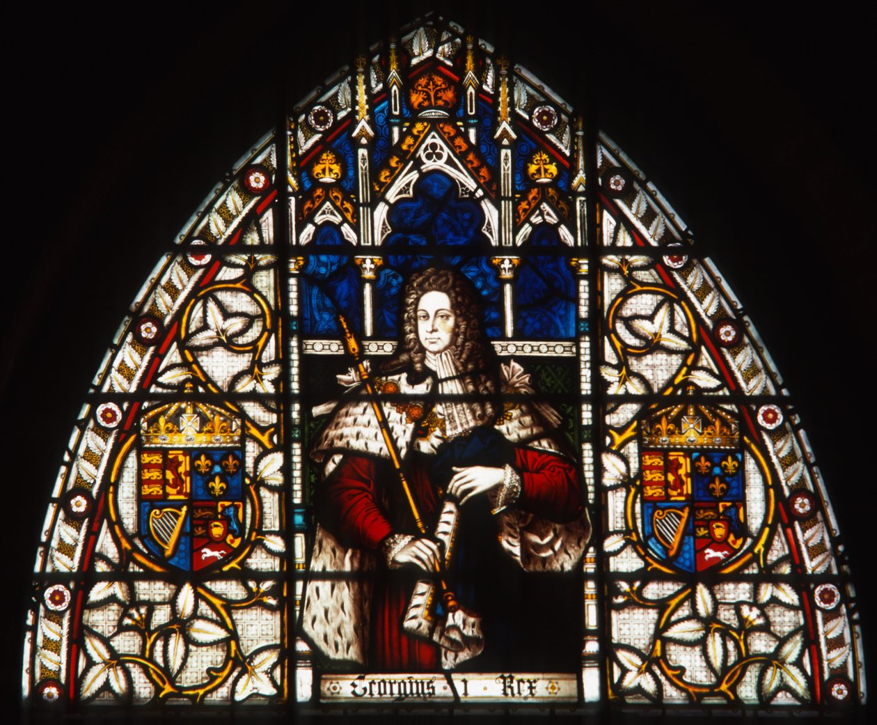 victorian · british · colonial · commonwealth · west indian · caribbean · barbadian · window · neo gothic · gothic revival · monarch · ruler · male · portrait · pointed arch · half length · crests · coats of arms · shields · heraldry · heraldic · royal · royalty · Parliament Buildings, Bridgetown, Barbados / Bridgeman Images