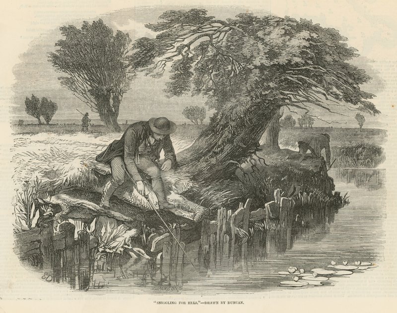 eels · fishing · rural scenes · rivers · london · river lee · people · sniggling · eels · Private Collection / Bridgeman Images · / Look and Learn |