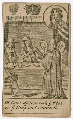 popish plot · playing · card · cards · propaganda · anti · catholic · titus oates · king · charles ii · council · Private Collection / Bridgeman Images · / Look and Learn