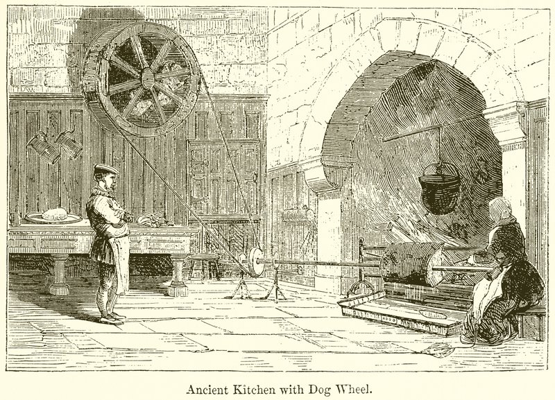 england · ancient kitchen · dog wheel · kitchen · utensils · cooking · animal · exploitation · fire · spit · Private Collection / Bridgeman Images · / Look and Learn |