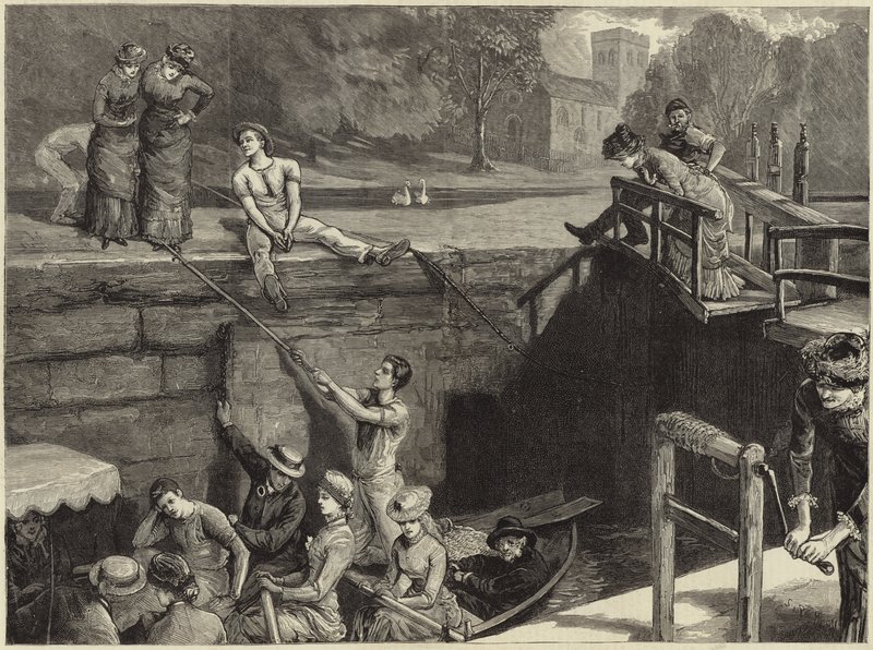 oxford illustrated · oxford · england · great britain · boats · people · women · river · scenes · iffley lock · river thames · rivers · Private Collection / Bridgeman Images · / Look and Learn